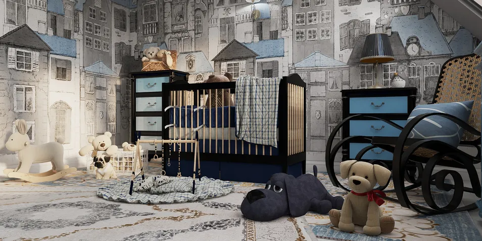 Un bello dormitorio para un bebe en un ático. El delicado empapelado en tonos grises y azul claro le dan elegancia y distinción al ambiente. Muebles estilo vintage con detalles en negro y plata le dan un toque especial y único. Una mecedora, juguetes y decoración completan este dulce diseño.