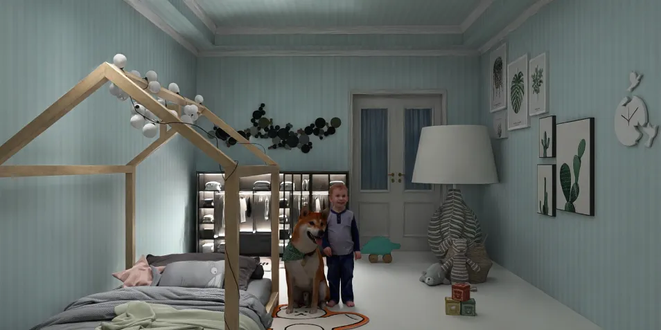 A little dark because it is night time, mom I coming and the baby is waiting to get dressed for bed with Mom. and the dog is company