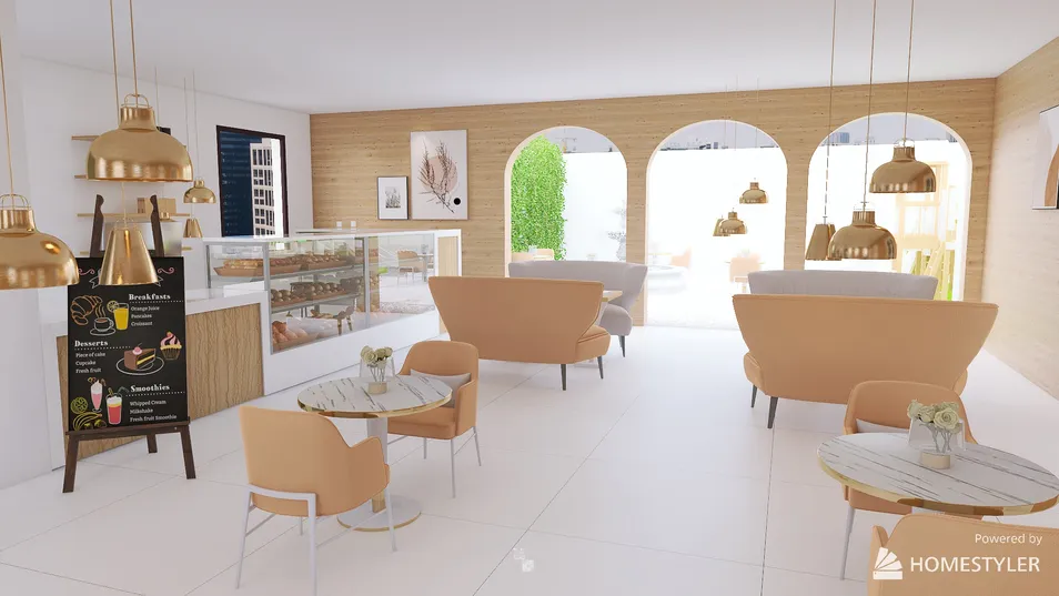 Urządzone w kolorystyce jasnej. Elementy bieli i różnych odcieni drewna. Dodatek złota przy lampach. Piekarnia z ogrodem. W ogrodzie stoliki, fontanna oraz miejsce do zabawy dla dzieci.