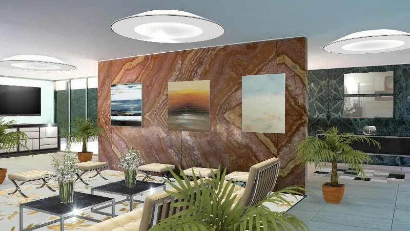 Barcelona Pavillion, designed by architect Mies van Der Rohe , is styled in a minimal way with specific barcelona chairs in white tones. The main wall of this free plan masterpiece is decorated with abstract modern paintings .