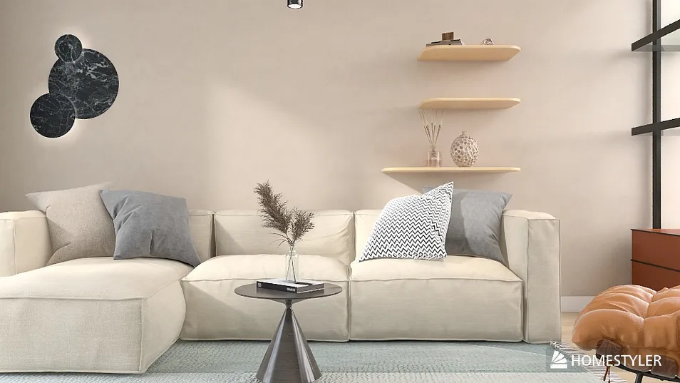 这个客厅以简洁的线条和温和的色调营造出舒适的氛围,沙发的柔软质感呼应了墙面上黑色圆形装饰的独特设计,简约而不失优雅。书架上的摆件则增添了一丝生活气息,仿佛在低语着家的温暖。