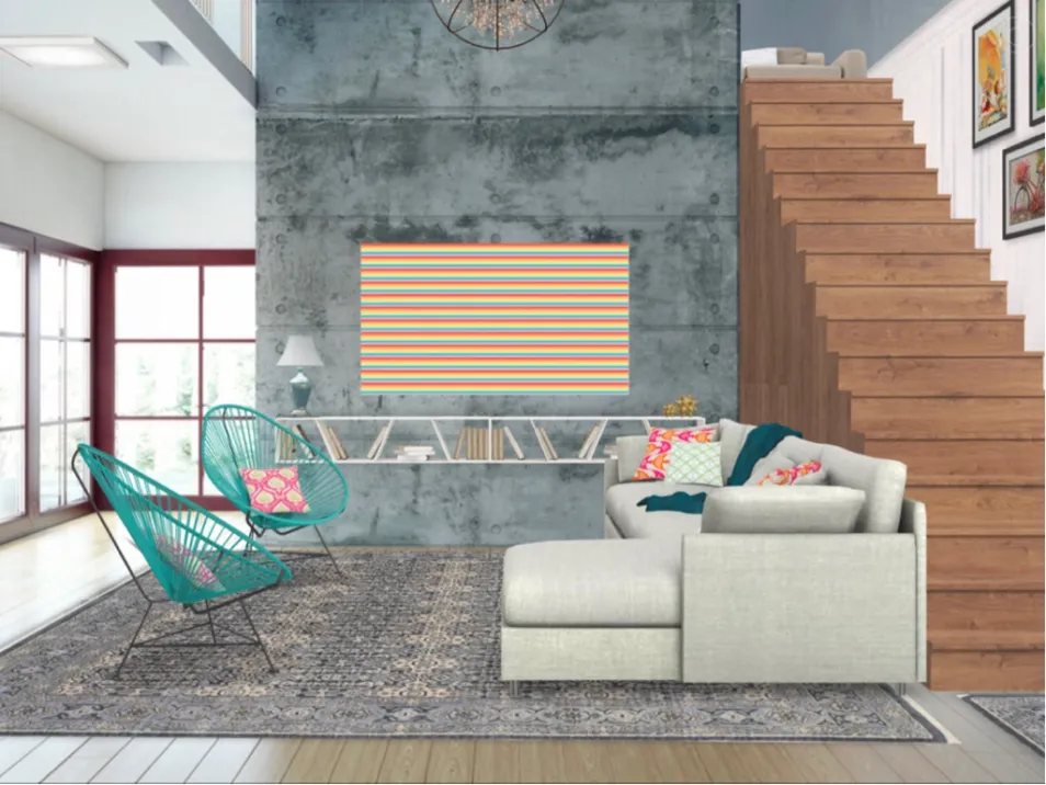 A comfortable living room with a colorful print as the center of attention