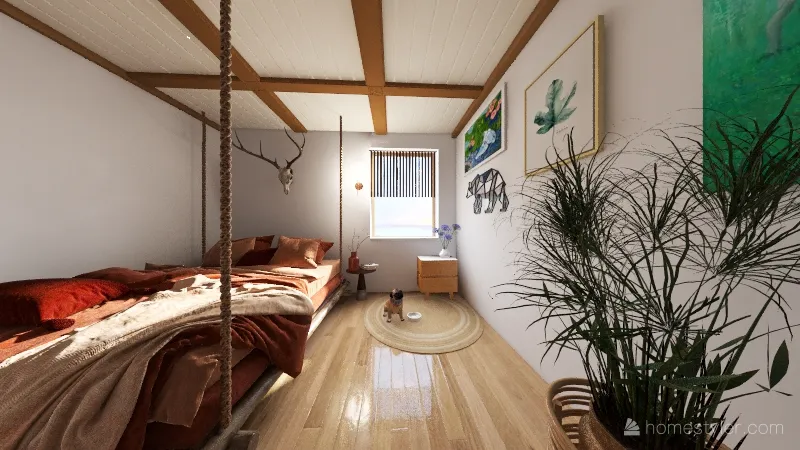 While designing this project I wanted to give this room a more open and comfy setting which is why natural lighting was key since it helps bring out depth to the different colors of this room. I enjoy playing around with different shades and materials, so for this specific room I incorporated different hues of wood throughout the from starting from the floor to the bed and the ceiling to make it more rustic, but to contrast it I've included paintings that pair well with the rest of this design!