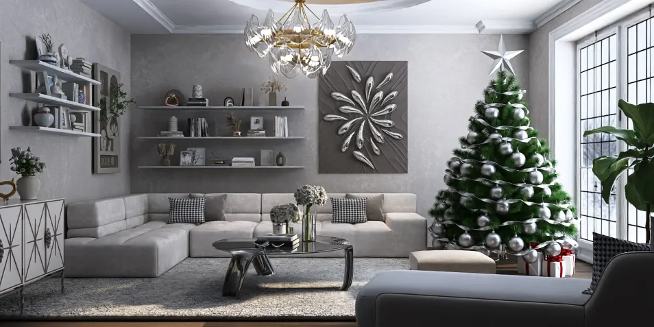 En este espacio, las líneas limpias y la paleta gris crean un refugio sereno. La iluminación suave resalta los detalles decorativos, mientras el árbol de Navidad aporta un toque festivo. Cada elemento, desde la mesa minimalista hasta las estanterías cuidadosamente organizadas, cuenta una historia de elegancia y armonía.