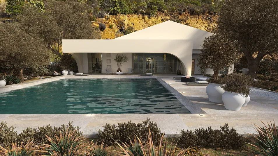 Villa con tonalidades neutras y bronce, conta de sala comedor con cocina abierta, dos dormitorios , dos baños y jardin exterior con piscina.
