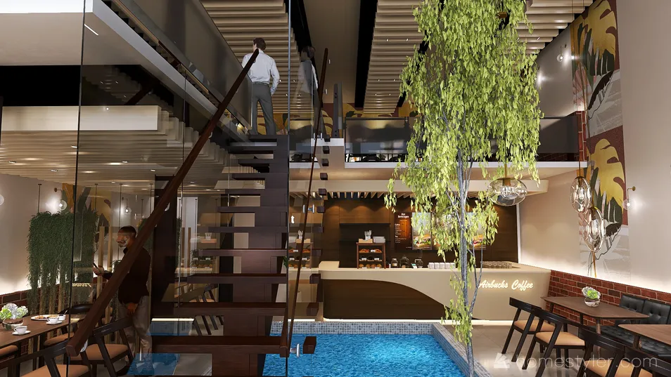 Mixed design by industrial style and modern style. Steel columns, brick used to feature the industrial design. I add wood stair, wood panels at ceiling to create sense of elegant to the design.