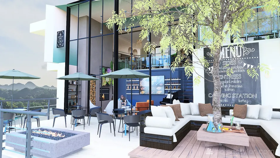 Ocean view cafe. On one side is the city and on the other the ocean. For this cafe I designed multiple spaces for different types of people. Spaces for groups, for families, for couples, for single people, there are also outdoor spaces with views of the sea and others with views of the city.