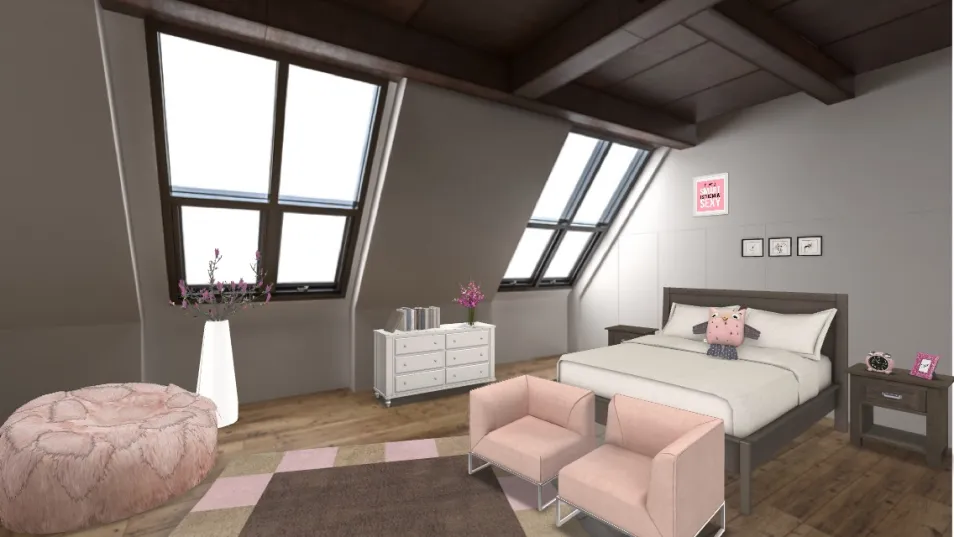 Stanza da letto per la figlia, tema rosa, situata in una mansarda