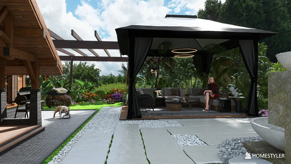 O gazebo, com seu design elegante, complementa a casa ao ar livre, criando um espaço perfeito para relaxar. A harmonia entre os materiais naturais e as plantas circundantes proporciona um refúgio sereno, onde cada detalhe convida à contemplação da beleza do ambiente.