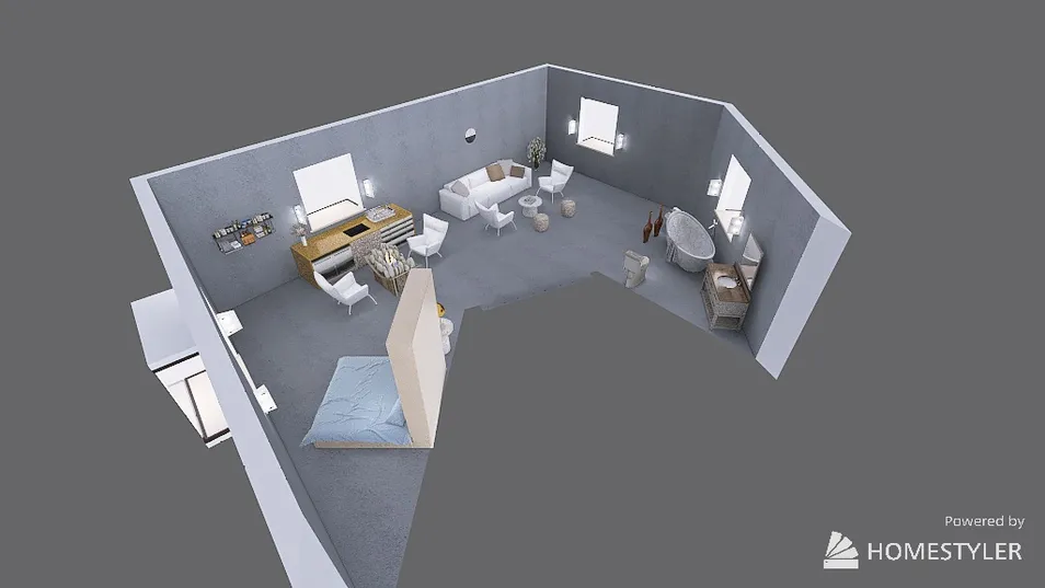 The design is made of imitation stone, in order to have a feel of ancient living. Only the most basic/most needed pieces of furniture are here. The only modern thing are the lights.