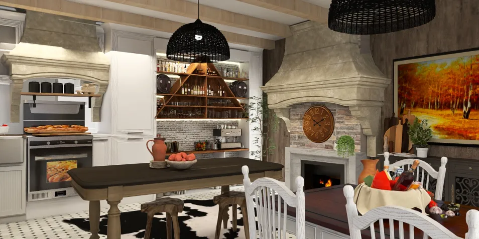 The kitchen, with its rustic charm, invites warmth and togetherness. A sturdy wooden table, adorned with fresh fruits, stands proudly under woven pendant lights, while the stone fireplace whispers tales of cozy gatherings. Each detail, from the textured walls to the inviting aromas, breathes life into this delightful space.