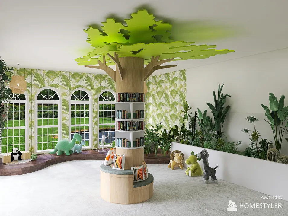 Here's my design of a multifunctional area dedicated for children. It's a jungle-inspired room that is designed with earthy tones and filled with natural lighting. It's a comfortable space, where kids can play, rest and study.