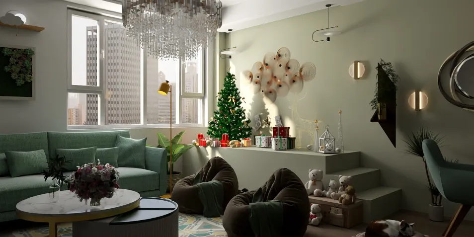 This is contemporary Theme based Christmas decor in a living room . the Color palette behind this is greeny means near to forest vibe has it is Christmas vibe so the colors are based on green and earthy tone palette.