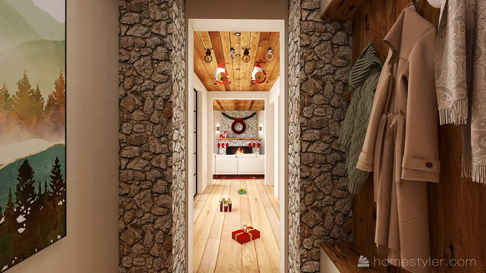 A small and cozy cottage, with a very particular shape, in the middle of the mountains. A unique cottage, to dream of a magical Christmas in the snow. For this cottage the typical materials of the mountain have been privileged: columns in river stones, fixtures and various furniture in solid wood. Warm and raw fabrics to make you feel at home. Santa has already arrived, he has lost some gifts along the way, the sleigh is parked outside, but he is not there ;) You should be chasing him all over the house, go!