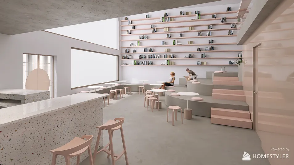 Reforma de cafetería en Castellón de la Plana, Valencia. Con una grada como elemento principal del diseño, se ha conseguido optimizar al máximo el espacio, respetando las normativas pertinentes al espacio, de accesibilidad, y respetando las necesidades ergonómicas. Con materiales como el microcemento y el hormigón pulido, y con tonos neutros y claros, se ha creado un espacio tranquilo donde leer un libro, trabajar, e incluso estudiar.