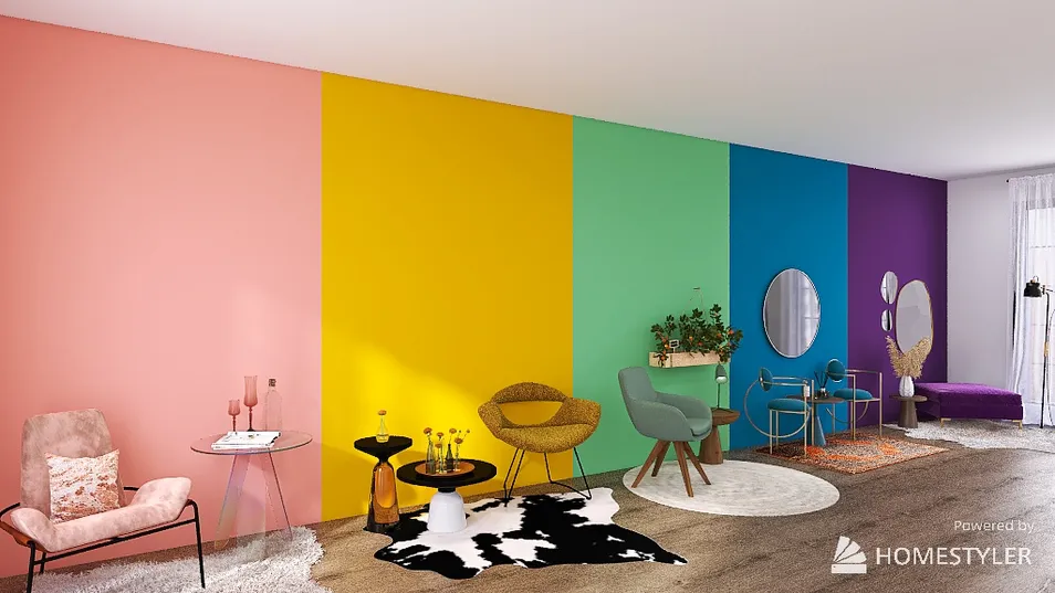 I wanted to design something with a lot of color that wasn't a typical room, so I decorated different parts of the room by color and styles. Each segment shows a sitting area.