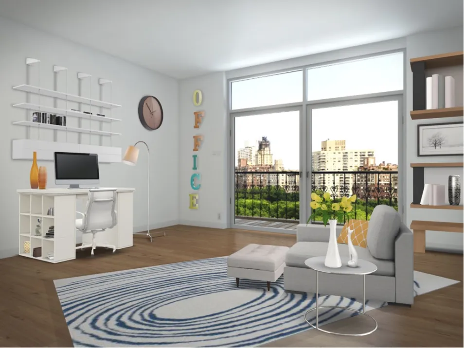 From the desk to the couch, this is a place to stay! The work area has lots of space, and still, there’s more to fill! There is lots of color making an interesting pallet. The sitting area is great for sitting and reading. The book shelf has plenty of space for books and decor. The light colors make the room look lighter and bigger, and the plant gives life to the room. All in all, it’s a nice place to hang out.