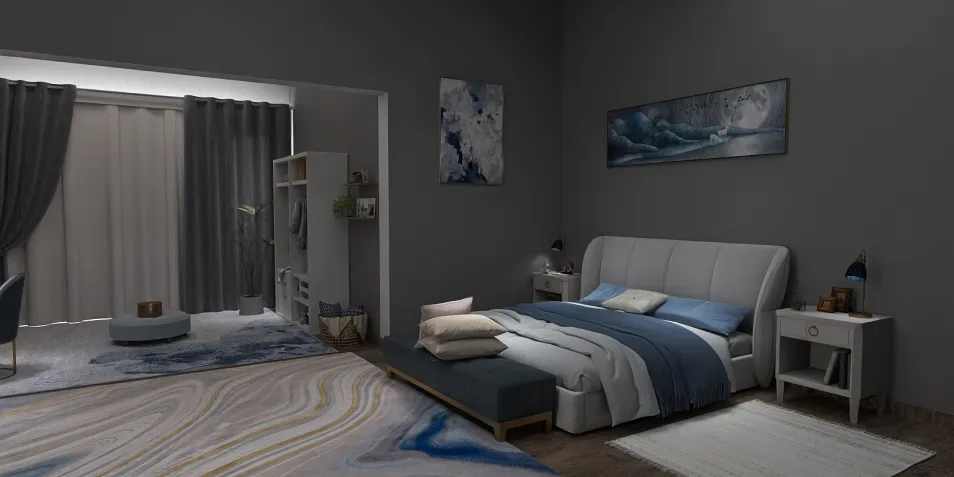 A blend of moody blues, soft fabrics, and warm lighting ✨ A quiet, contemporary space that feels calm, cozy, and elevated.