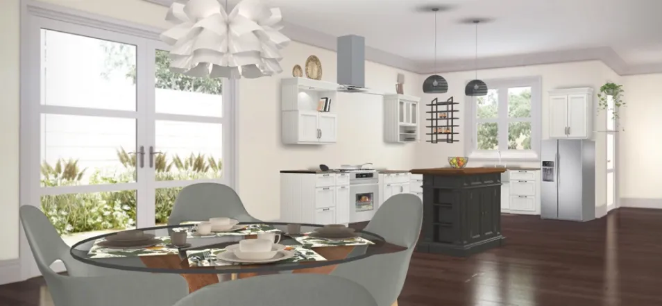Decorated around the kitchen cabinets that’s got kind of a farmhouse style trims and handles. The ceiling lamps above the island is supposed to be transparent glass but I kind of like how it turned out to be black. I couldn’t decide on what color china to put on the dining table so I just chose two 😝.