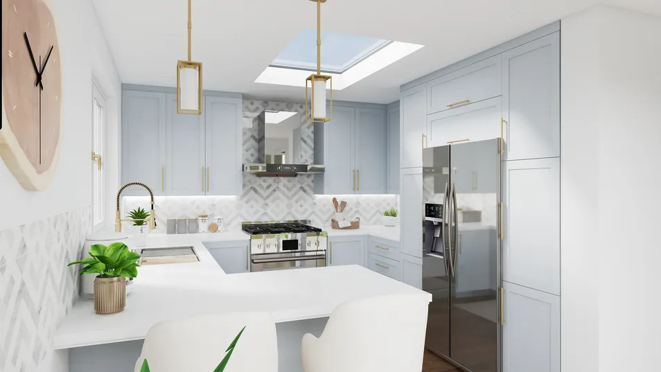 Small, bright, and airy, this contemporary kitchen with soft blue cabinetry and gold accents invites warmth. Natural light floods through the skylight, enhancing the minimalist aesthetic while the stylish layout ensures both functionality and elegance in every corner.