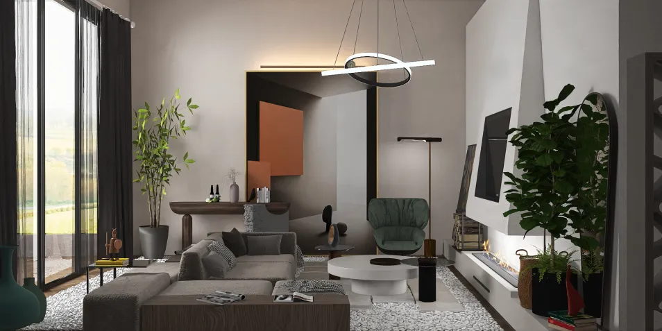 A contemporary modern living area design by choosing primary colors, layering of furniture, oversized lighting
