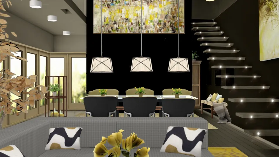 there's nothing better to make a high contrast than black and yellow. It's a different angle from the living room with modern ornaments and some details. It's a very dramatic decor and color combination, but it's still looks like a family house, I guess. The staircase is beautiful and very attractive to the eyes. ☺