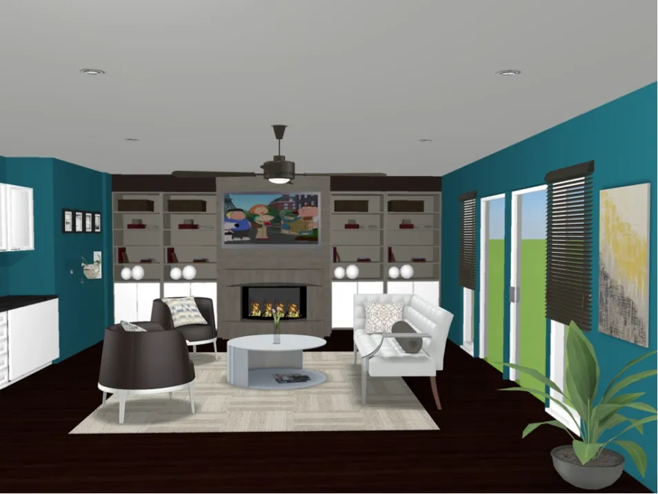 Within this living room layout the furniture has been shifted to the center of the room. Two Omni chairs sit opposite of the sofa, moving the eye towards the focal point in the room: the fireplace. Built-in bookcase shelving with base cabinet storage are on each side of the fireplace, with a small bar kitchenette on. The adjacent wall.