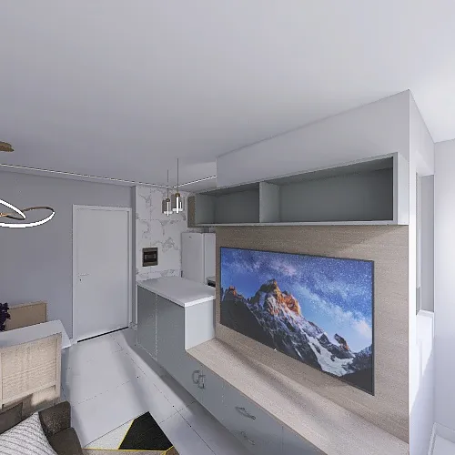 Este projeto de apartamento com cozinha e sala integradas foi desenvolvido para otimizar espaços pequenos, típicos de áreas periféricas de São Paulo. A proposta utiliza uma planta aberta para ampliar a circulação e criar um ambiente fluido. Armários modulares sob medida, com portas de correr, foram criados para aproveitar ao máximo o espaço. A iluminação combina luzes diretas e indiretas, com LED embutido e luminárias pendentes para um ambiente acolhedor e funcional. Os móveis são compactos e multifuncionais, com estantes e sofás planejados para maximizar o uso do espaço. Materiais como cerâmica para pisos e MDF para os armários garantem durabilidade e facilidade de manutenção. Elementos como tijolos aparentes nas paredes trazem um toque urbano e moderno, refletindo a identidade da arquitetura paulista na periferia.