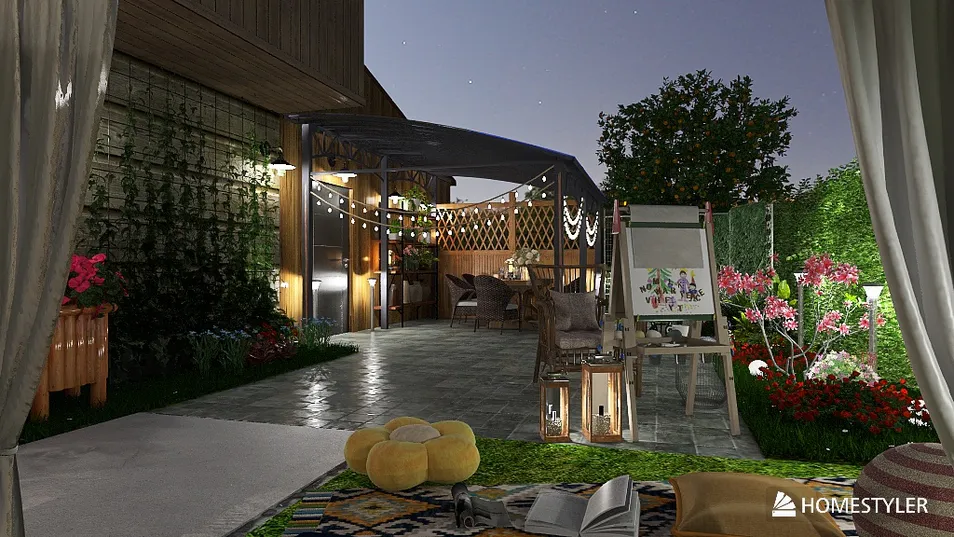На этом пространстве, где светильники мерцают, а воздух напоен ароматами шашлыка, каждый элемент становится частью симфонии. Тень беседки мягко обнимает пестрые цветы, как будто говорит: 'Здесь нет места для суеты, только для мгновений.'