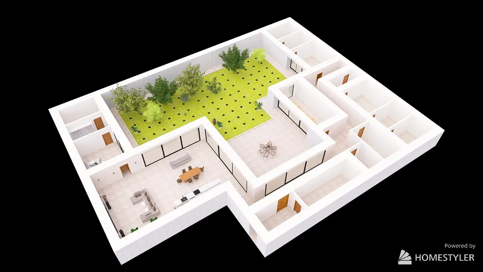 This is a basic study about the space required for a house fully wrapped around a courtyard. Usable floorplan 448 m2, courtyard 400 m2, lot 1600 m2. The thick walls are meant to have heavy thermal and acoustic insulation.