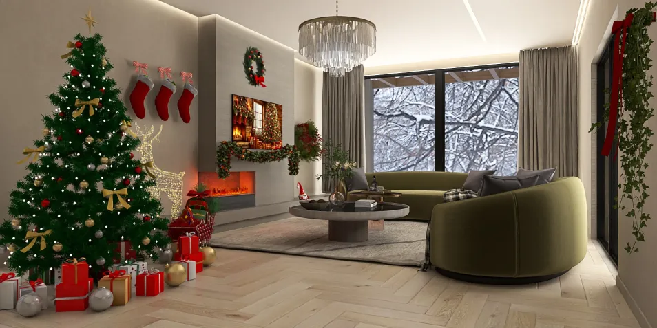 The living room exudes warmth with its lush green sofa and twinkling lights. A towering Christmas tree stands proudly, adorned with shimmering ornaments. Stockings hang by the fireplace, while soft snowflakes dance outside. It's a perfect blend of festive cheer and intimate comfort.