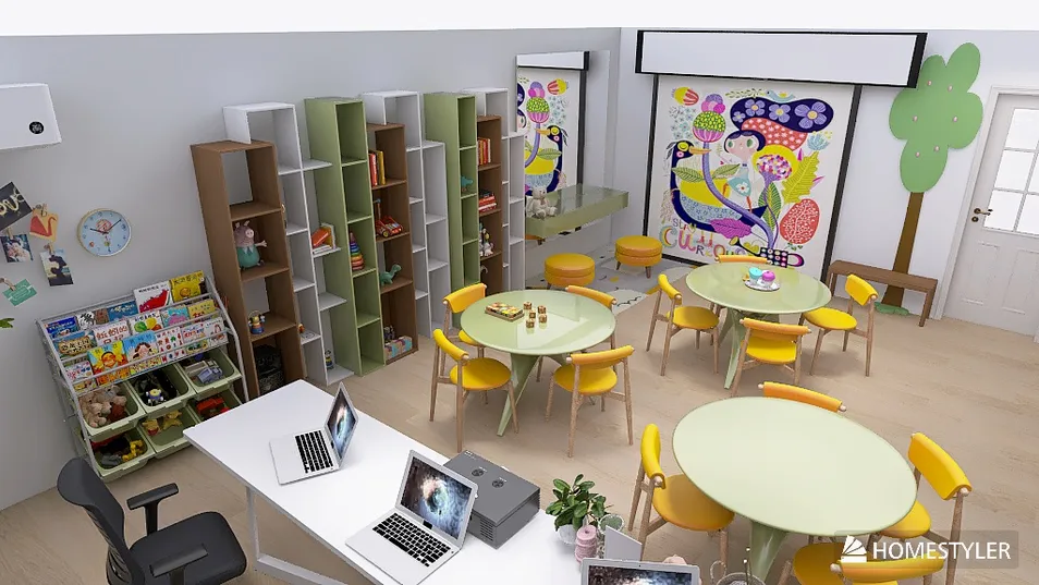 In a vibrant room filled with playful yellow chairs and soft green tables, creativity blooms. Shelves overflow with colorful books, while walls adorned with whimsical art invite curiosity, echoing the laughter of young minds exploring boundless possibilities.