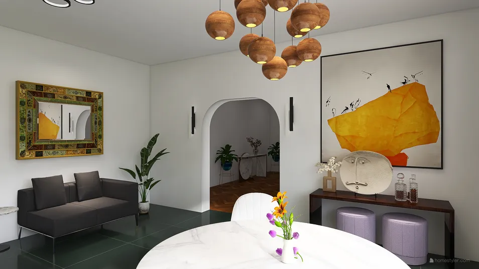 Cucina e sala da pranzo con angolo relax. È un ambiente moderno dalle sfumature eleganti. I materiali utilizzati vanno dal marmo bianco al legno pregiato. Ma anche ceramica e metallo. È un 'lusso semplice', ordinato e con ciò che serve. Due specchi a muro, uno sopra il mini divano e l'altro alle spalle degli sgabelli in cucina. Amplificano lo spazio e lo rendono più luminoso. Sotto la consolle due pouf in tessuto, come due sedute da aggiungere. Illuminazione: due led all'entrata ad arco, una lampada pendente sul tavolo da pranzo e al tavolo-isola. Una plafoniera e un led in zona cottura.