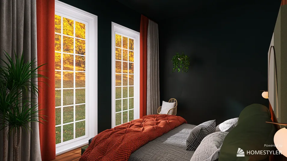 Brief: a dark moody bedroom, with a cosy atmosphere and the feeling of bringing the outside in. Bedroom requires some kind of storage, ideally hidden. Design: the design takes inspiration from nature, primarily using dark greens and greys as well as wooden and woven elements to bring texture to the room. Double doors, the only elements to be painted in bright white, highlight the view outside and connect the room to the outside environment. The room is split into two connected sections, with the wardrobes and storage hidden behind the bed head.