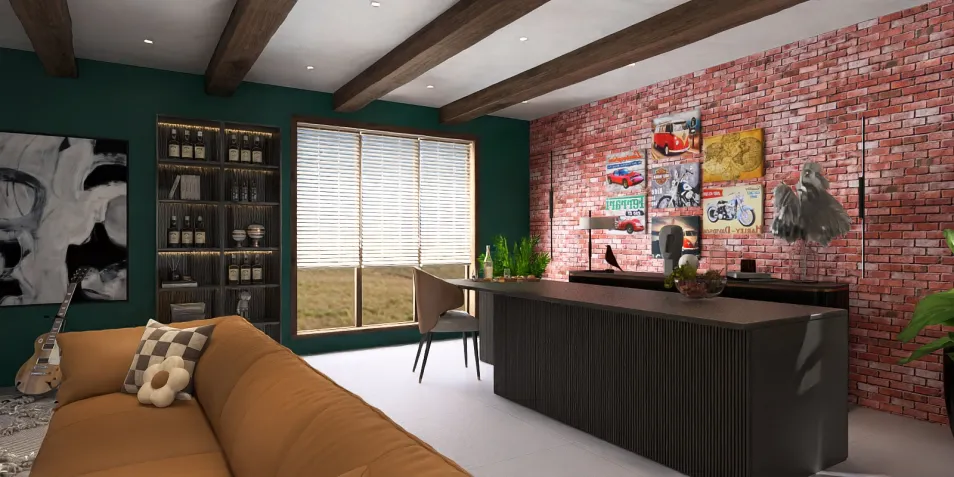 Imagine a sanctuary where shadows waltz with the flicker of candlelight. Dark wood beams cradle the ceiling, while exposed brick whispers secrets of time. A plush sofa beckons, adorned with melancholic hues, inviting you to lose yourself in the depths of classic elegance.