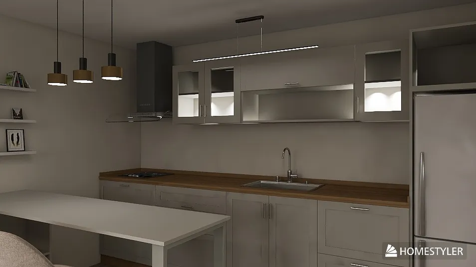Este departamento combina tonos tierra y calmos, creando un refugio sereno. La cocina, con madera natural, invita a la convivencia. El dormitorio, iluminado suavemente, es un espacio de concentración. Un baño práctico complementa el diseño, donde cada detalle respira funcionalidad.