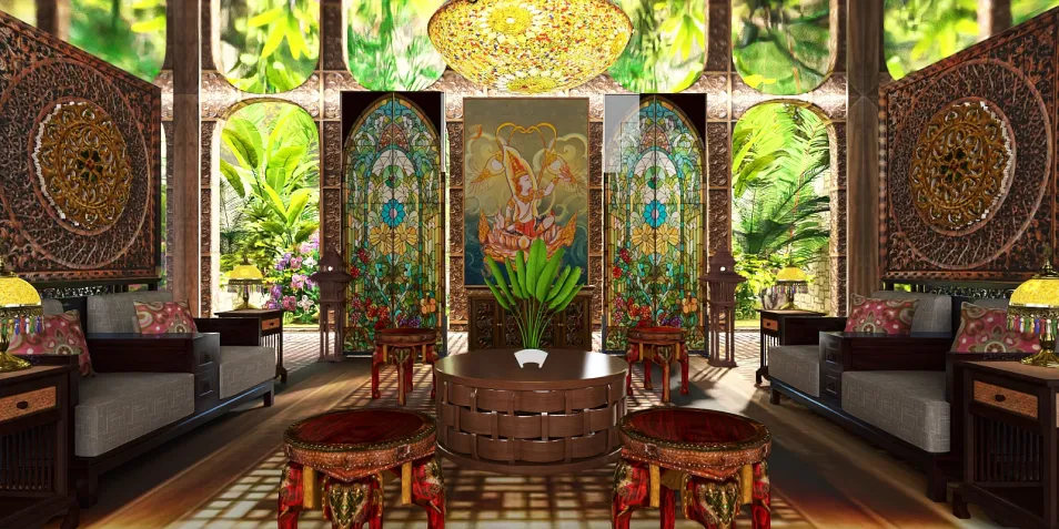 In this vibrant space, intricate patterns dance across the walls, illuminated by soft, filtered light. Lush greenery peeks through stained glass, creating a serene sanctuary. Each piece, from the ornate furnishings to the delicate decor, tells a story of craftsmanship and harmony with nature.