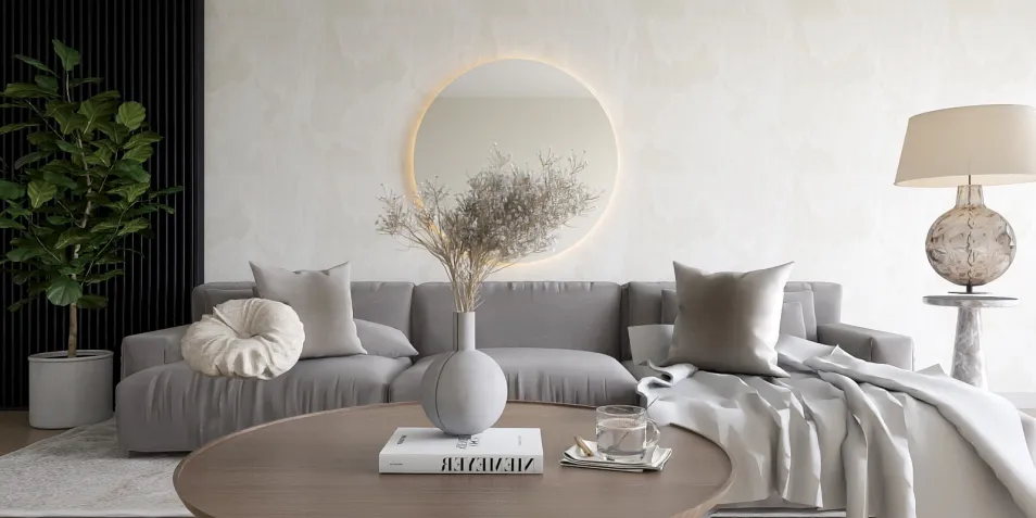 In this serene space, muted tones embrace the elegant simplicity of modern living. The soft textures of the cushions and the gentle curve of the vase invite relaxation, while the round mirror reflects a world where comfort meets understated sophistication.