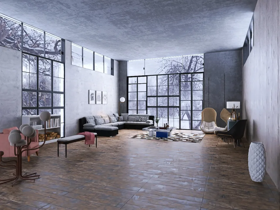 The spacious room, with its large windows letting in the winter light, feels both inviting and stark. The minimalist furniture creates a sense of calm, while the warm wooden floor contrasts with the cool concrete walls, inviting quiet contemplation amid the chill.