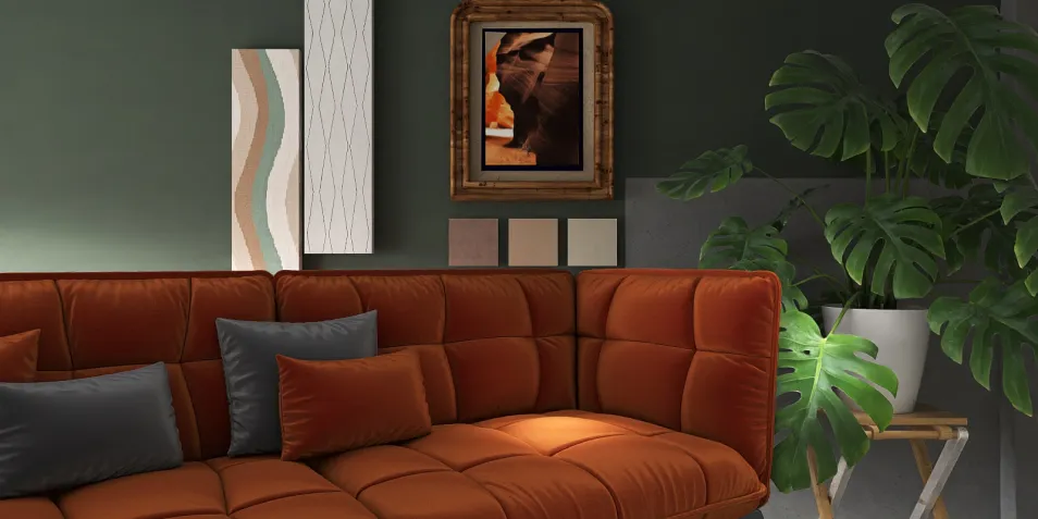The rich, burnt orange sofa embraces you like a warm memory, while the lush green leaves whisper secrets of a forgotten past. Each accent piece tells a story, blending comfort and elegance in a dance of shadow and light.