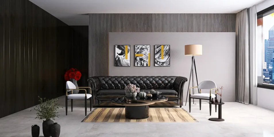 In this chic space, a black leather sofa exudes timeless charm, flanked by sleek armchairs. The interplay of light and shadow creates a dance of textures, inviting contemplation. Here, simplicity meets sophistication, urging one to linger a little longer in its serene embrace.