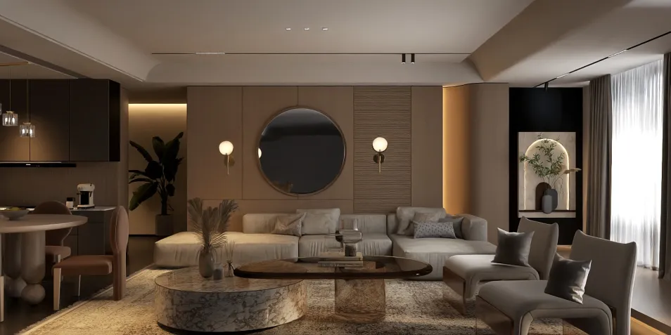 In a serene blend of soft neutrals, the space unfolds with an inviting embrace. Curved lines and subtle textures dance together, creating a haven of comfort. The gentle glow from the sconces highlights the artistry of each detail, inviting moments of quiet reflection.