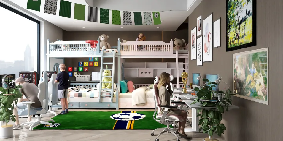 one of the girl is getting ready to sleep,other is face timing her bf on her p c and the boy with crossed arms is waiting for his gta5 to be installed other boy is working