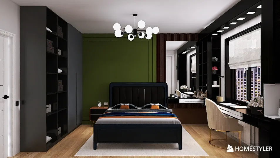 В этом пространстве царит гармония. Черный кожаный диван, обрамленный изумрудной стеной, наполняет комнату глубиной. Светильник, словно звезды, свисает с потолка, а пол из светлого дерева добавляет тепла. Здесь каждый элемент дышит уютом и современностью.