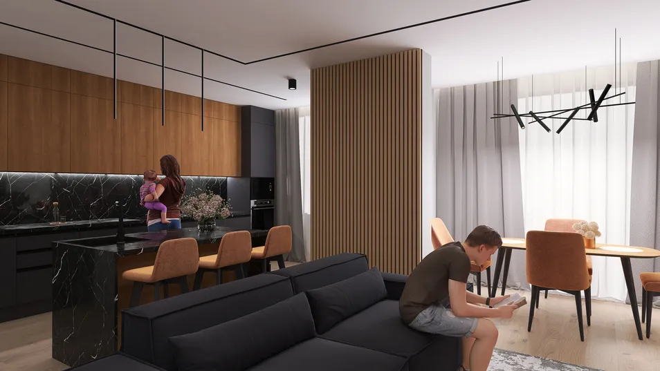 В этом кухонном пространстве царит гармония между темным мрамором и теплым деревом. Светлые акценты добавляют уют, а минималистичный дизайн позволяет сосредоточиться на простых радостях, таких как улыбка ребенка на руках у мамы.