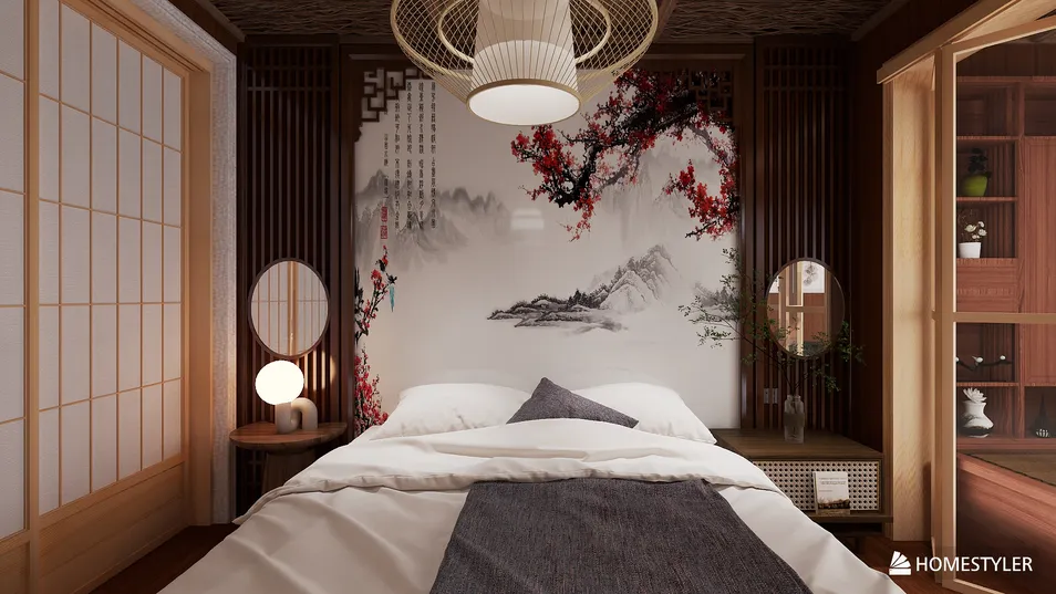 O design deste quarto asiático, inspirado no Japão, destaca-se pela sua simplicidade e harmonia. A ante sala de chá, essencial na cultura oriental, oferece um espaço para meditação e socialização, refletindo a importância do ritual do chá na união e tranquilidade.