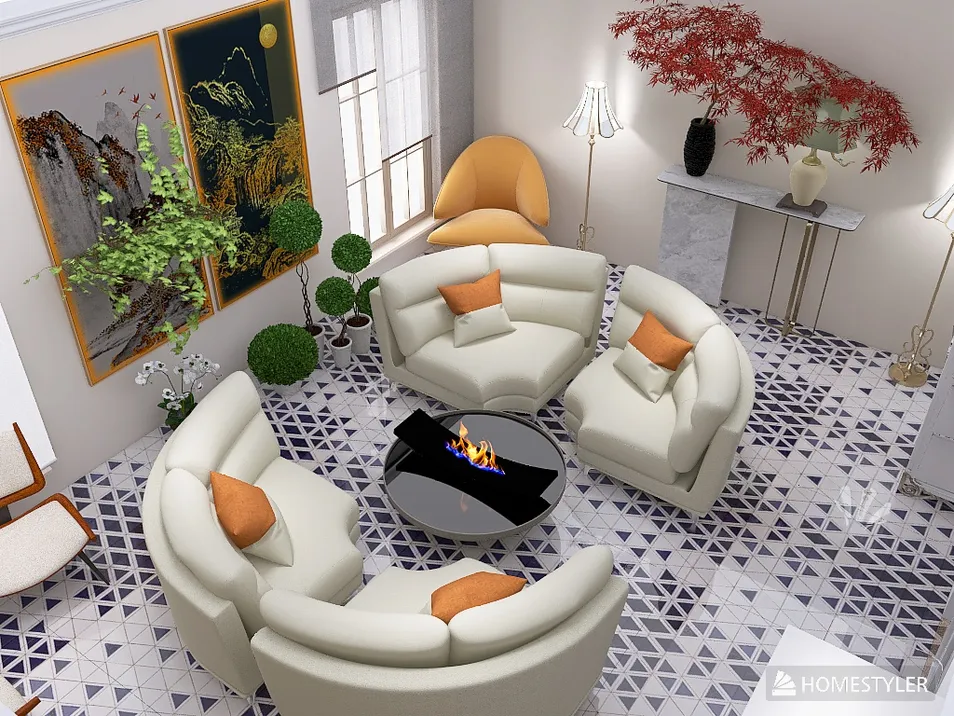 Bright living room, cozy, light. Fireplace in the center of the room, plants, large sofa all for relaxation, pleasant conversations and positive emotions.