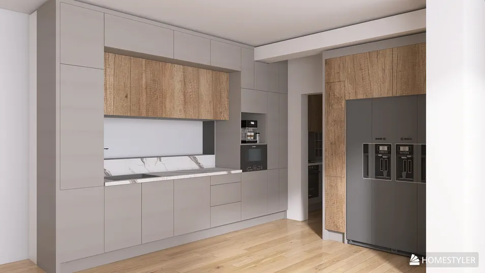 In a symphony of sleek surfaces and warm wood, this kitchen embodies minimalist sophistication. The seamless cabinetry whispers of functionality while the marble countertop invites culinary creativity, revealing a space where simplicity reigns yet elegance lingers in every corner.