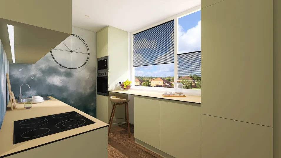In this small, practical kitchen, wasabi-green cabinets harmonize with a stormy sky wallpaper. A design clock stands out, complementing the morning coffee nook by the window, offering a perfect view. Every detail is thoughtfully curated, ensuring functionality meets aesthetics in this tranquil space.