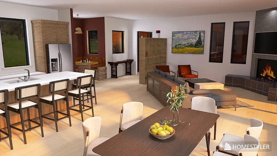 I seek advice on having corner fireplace vs main wall feature. Also room division and declutter. And maybe color schemin This room blends functionality with style, featuring a spacious kitchen that invites gatherings, while the cozy seating area beckons for relaxation. Large windows flood the space with natural light, creating a warm atmosphere perfect for both socializing and unwinding.